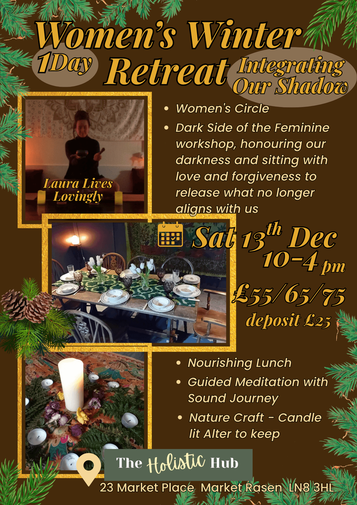 This day is for Women, we will start with a Women's Circle and Delve straight into the Dark Side or Shadow side of the Feminine, so we can understand how conditioning runs so deep through our broken culture. But better yet, how we can step into a healed Culture. Finishing the morning with a Guided Meditation with Drum and Tibetian Bowls Sound Journey, using Shamanic Quantum Meditation heal heal the past and mend the future. A Nourishing Lunch will be served upstairs, giving time also to connect and share amongst likeminded souls. And after we will gather again downstairs to create our own Candle Lit Alter to take home and keep a Divine Light burning for us through the WInter.